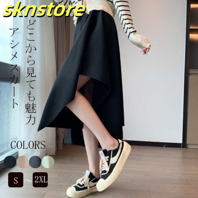 アシメスカート レディース 春夏 スカート Aラインスカート フレア裾 ミモレスカット プリーツスカート アシンメトリー キレイ ブラック グリーン グレー グレージュ 黒 体型カバー