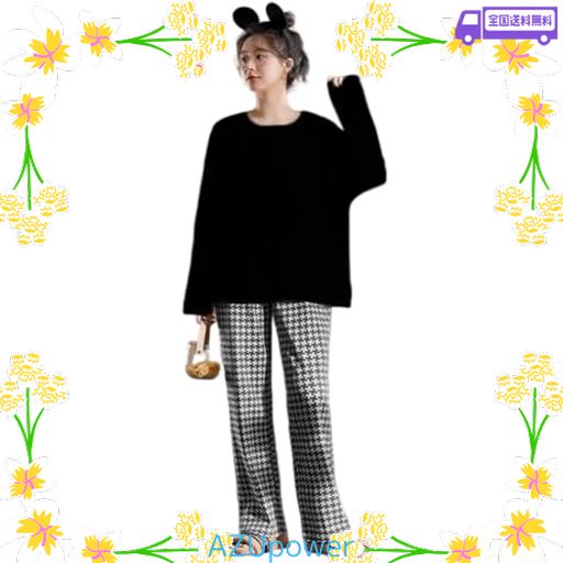 [PLUVIVA] パジャマ レディース ルームウェア 長袖 部屋着 上下セット 大きいサイズ 寝巻き 寝間着 トラベル 快眠パジャマ ロングパンツ 黒 無地 春 秋 5011-BLK-XL