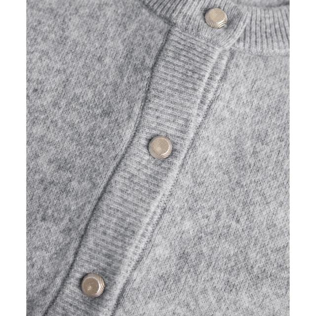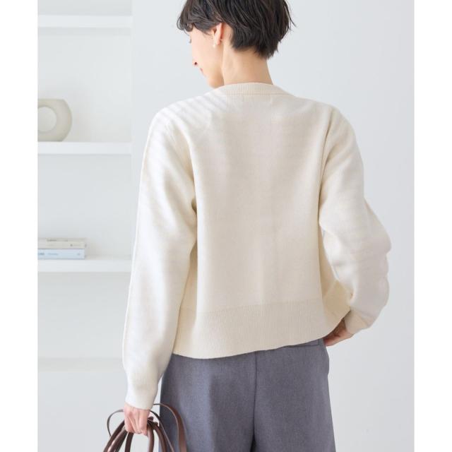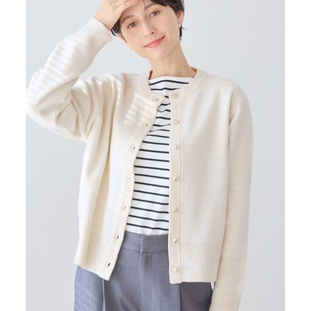 ・前のボタンを全て留めて、一枚のニットプルオーバーのように着こなすスタイルも◎。
