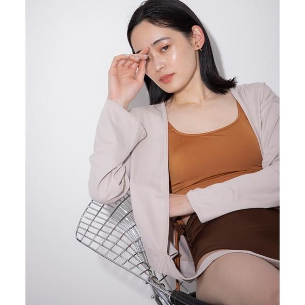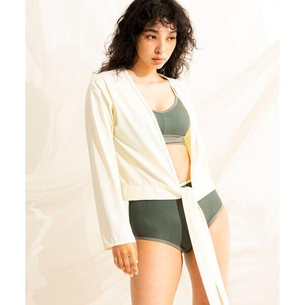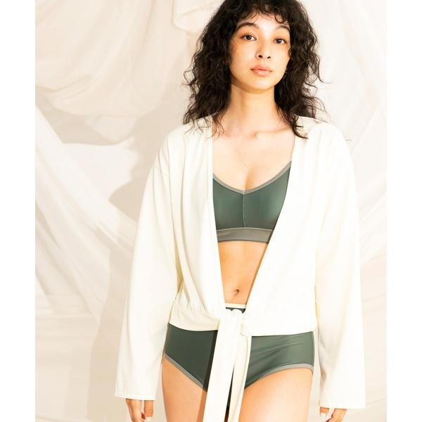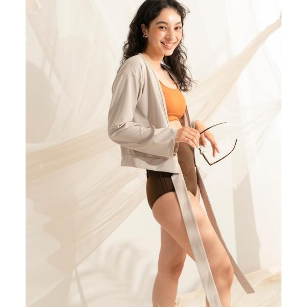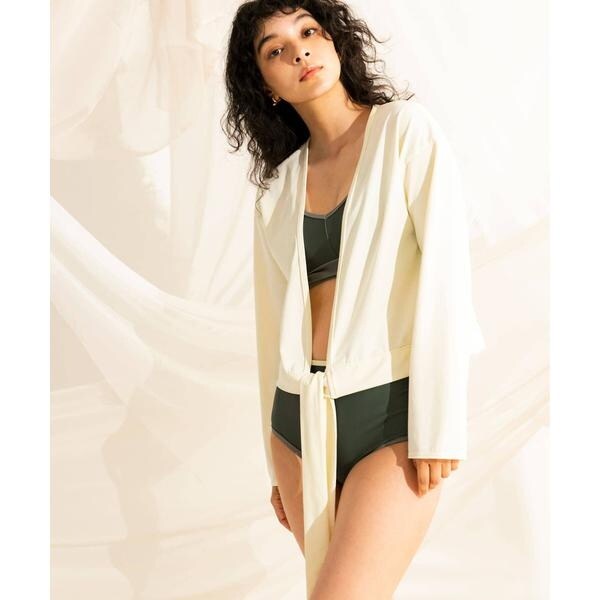 洋服感覚で気軽に羽織れるラッシュガードです。リボンの結び方は様々でアレンジが可能です。さらっと羽織るだけでもこなれた雰囲気のでる逸品です。