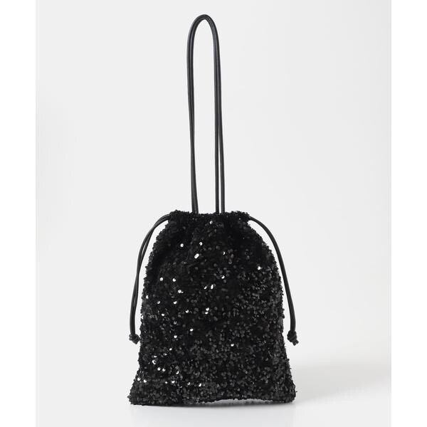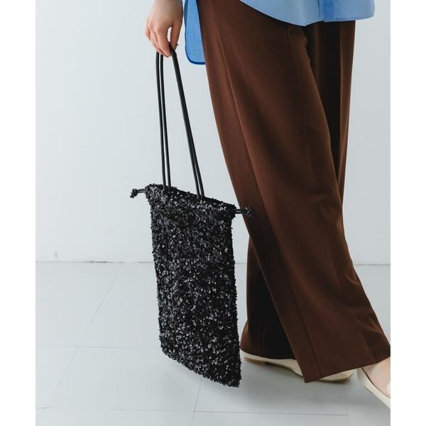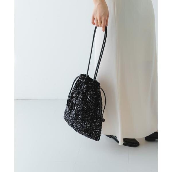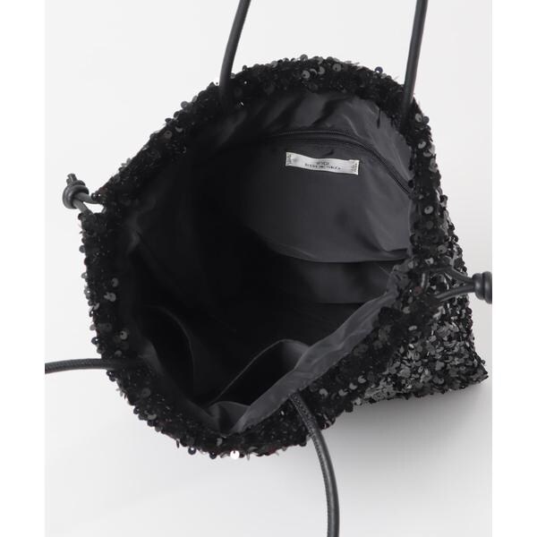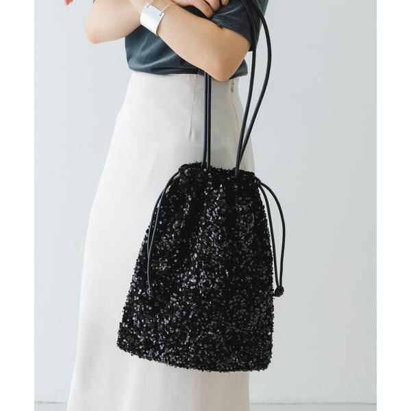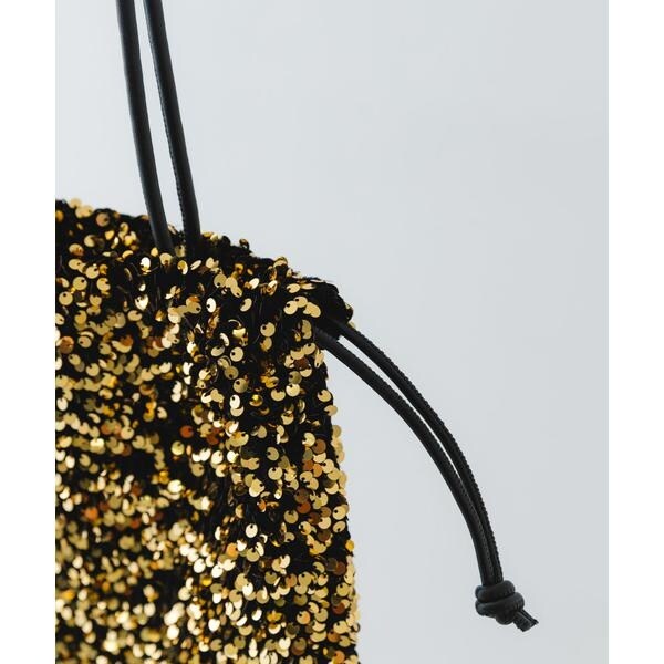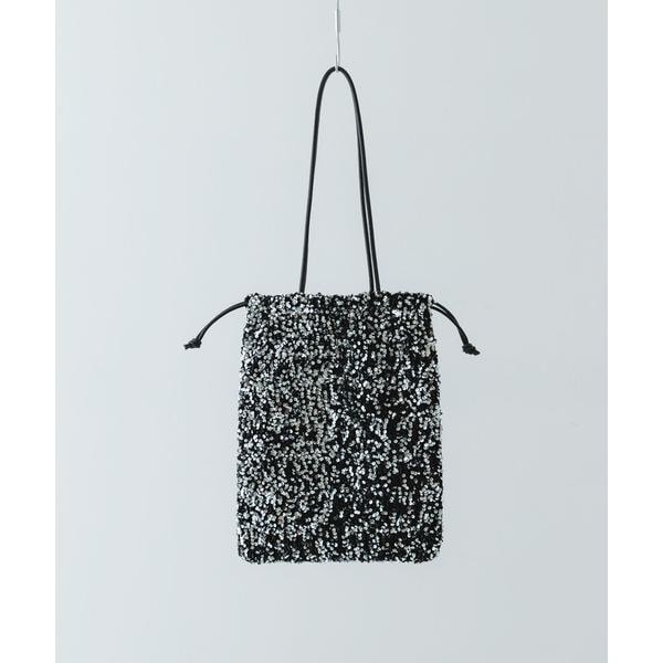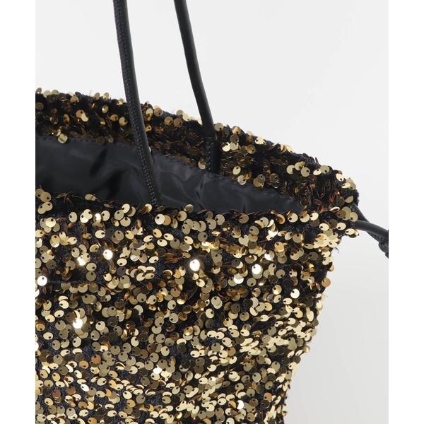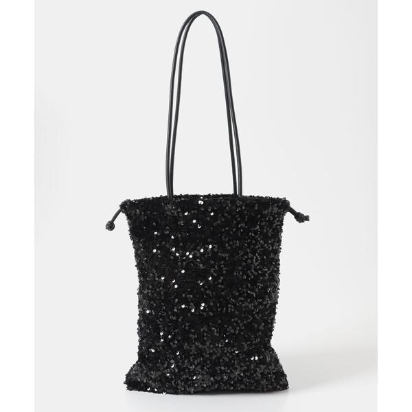 ダークトーンの色が多くなりがちな秋冬のお洋服に華やかな印象を与えてくれるスパンコールをふんだんにあしらったドロストトートバッグ。ドロスト部分を絞ると巾着型になり表情を変えてお使い頂けます。