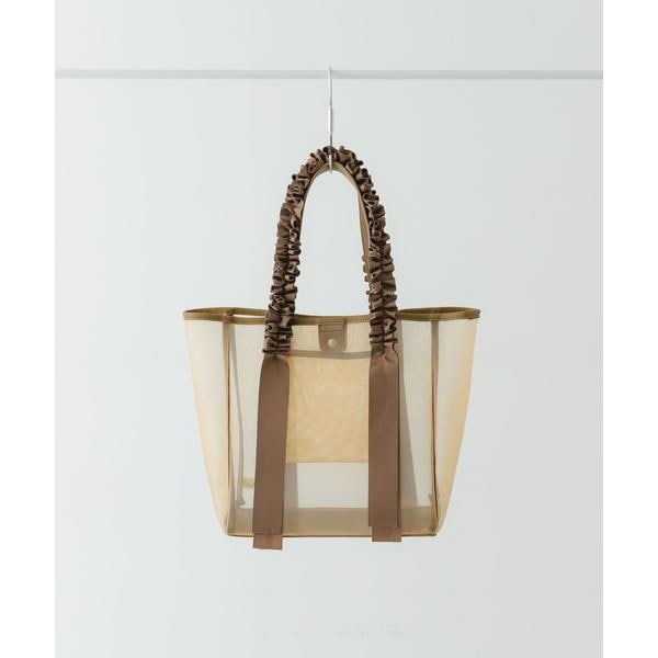 シアー素材にグログランリボンをあしらった、フリルデザインが目を引くトートバッグです。しっかりとマチがある大容量サイズなので、荷物が多い日にも安心してお使いいただけます。内ポケット付きで小物の整理もしやすく、夏のレジャーやお出かけにぴったりの軽やかで華やかなバッグです。