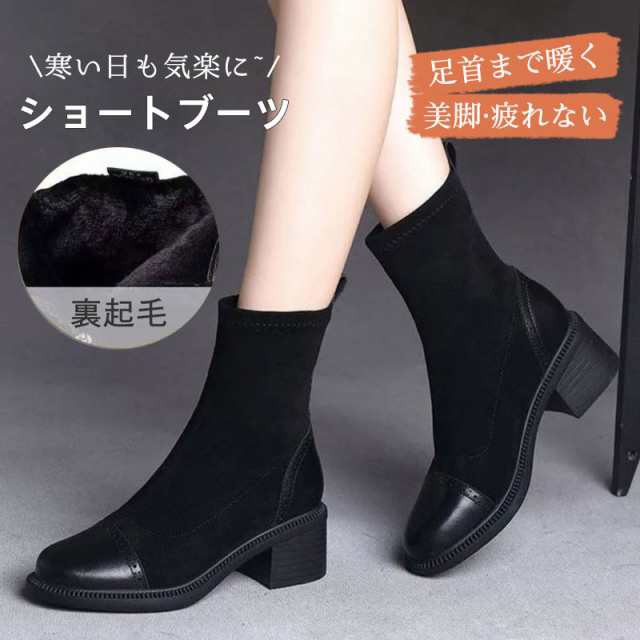 冬新作 ソックスブーツ レディース ショートブーツ 太ヒール チャンキーヒール ブーツ ショート 黒 裏ボア 秋冬 シンプル カジ