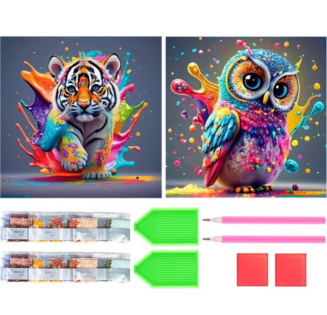 【5 Dダイヤモンドアート キット】トラ フクロウ 2個セット 四角いビーズ ダイヤモンドアートには必要なすべてのツールが付属しています。高精細日本語キャンバスx2枚、ダイヤモンドペンx2本、粘土糊x2個(2x2cm)、ビーズトレ イx2個、カラフルな四角いビーズx2 を含むる。ダイヤモンド スクエア ビーズの不足を避けるために、ビーズの数を30%増やします。