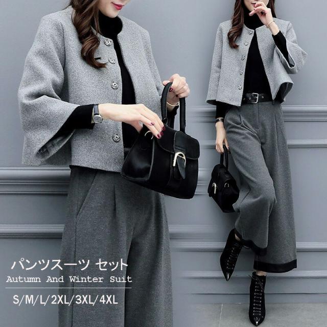 セットアップ ワイドパンツ レディース 秋冬 パンツ ウール混 ガウチョパンツ コート 卒業式 服 母 ウール混アウター 通勤 入学式 卒業式 フォーマル ママ 40代 大きいサイズ