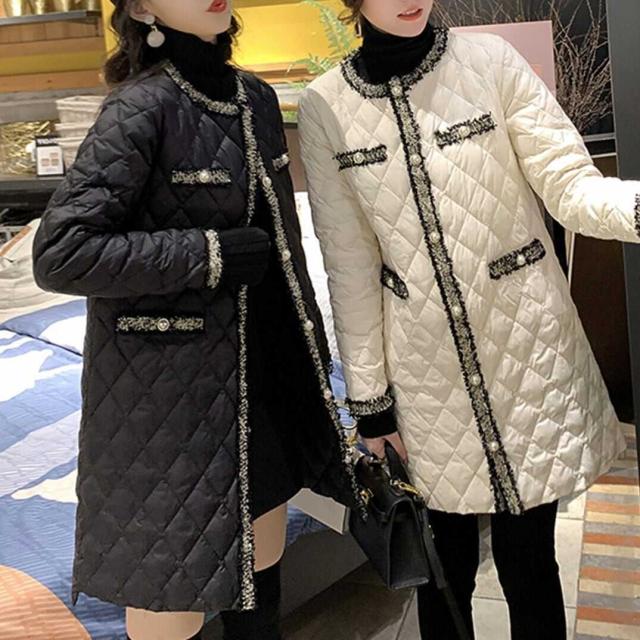 キルティングコート レディース アウター ダウンコート 切り替え ツイード ペールボタン ノーカラー キルティング マニッシュ 薄手 韓国風 幾何学模様 ロング丈 軽い 軽量 冬服 厚手