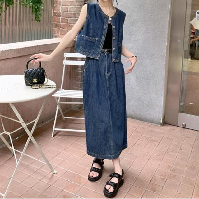 セットアップ ベスト デニムスカート ミドル丈 袖なし 上下セット 2点セット ツーピース かわいい 大人可愛い シンプル カジュアル おしゃれ かっこいい レトロ 大人女子 こなれ感 ラフ