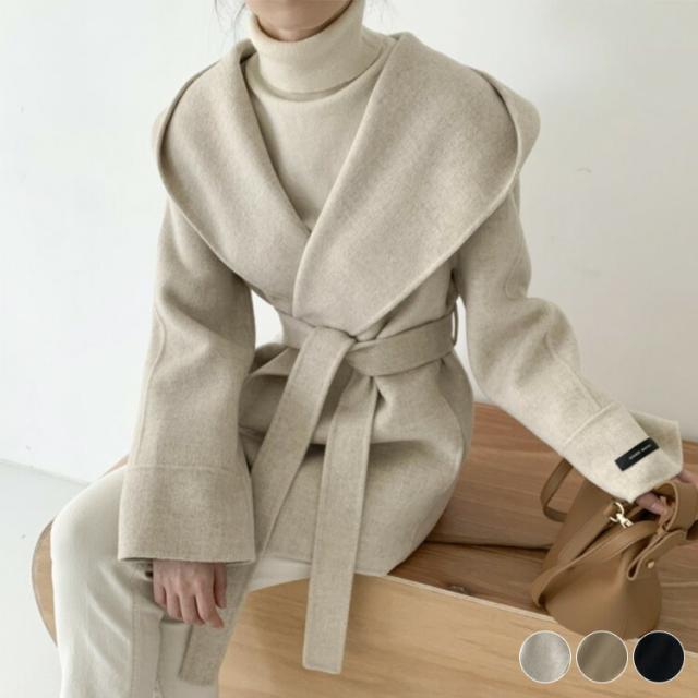 ベルトでウエストをマークするとショールカラーのガウン風アウターのようでスタイリッシュでエレガントな雰囲気に。