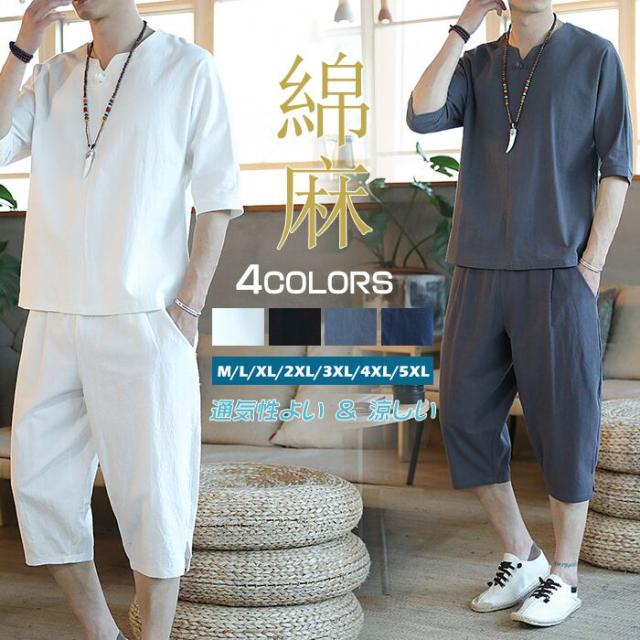 『部分即納』セットアップ メンズ 夏 綿麻 2点セット カジュアルセットアップ 半袖 上下セット リネン 半袖シャツ サルエルパンツ 五分袖Tシャツ 七分丈綿麻パンツ 春夏 涼しい ゆったり 通気性よい 父の日 ギフト 無地 M-5XL