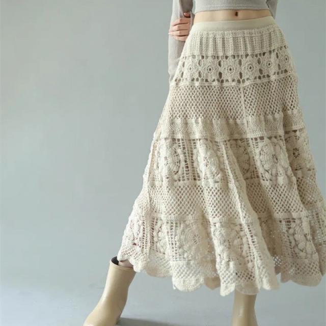 他には無いデザイン かわいいざっくりモチーフ編みのロングスカート 春物 初夏レディースファッション ボトムス スカート