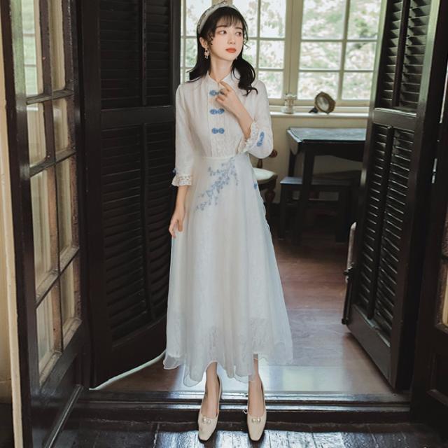 秋 大きいサイズ レトロワンピース レトロ レディースワンピース ワンピース ドレス 刺繍ワンピース ロング 七分袖 刺繍 チャイナ風 チャイナボタン エスニック 花柄 ボタニカル チャイナドレス チ