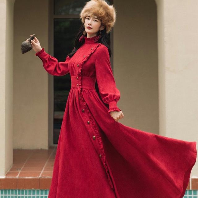おしゃれ 大人気 赤 流行色 韓国 大人っぽい ロング フレア 個性的 ワンピース ワンピ レトロ レトロワンピース S M L XL