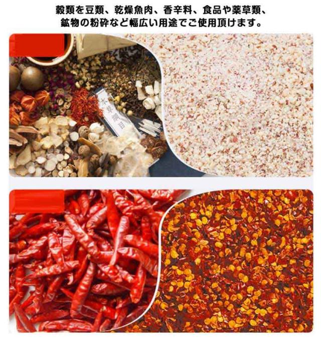 | 業務用、家庭用でも使える大容量小型軽量 電動製粉機。4枚刃付き! 高速回転により均一的で粉砕を短時間で実現します。 穀類を豆類、乾燥魚肉、香辛料、食品や薬草類、鉱物の粉砕など幅広い用途でご使用頂けます。 様々な角度へ傾けながら粉砕することで均一な微粉砕をすることができます。 蓋は半透明で見やす便利! オリジナルのコーヒーやお米や麦、大豆、乾燥穀物、乾燥茶葉、干きのこ、煮干し、乾燥魚肉、乾燥海藻、乾燥したトウガラシ、チリ、八角、シナモン、コショウ、クルミ、コーン、種、山椒、カカオ、コーヒー、ピーナッツ、鉱物など何でも粉砕するミルメーカーです。 | |