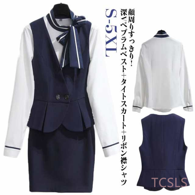 | 【顔周りすっきり!深Vペプラムベスト+タイトスカート+リボン襟シャツ】 着?せ効果抜群のオフィススーツ3点セット。 お家で洗えるのがうれしい。 制服、事務服として大活躍。 | |