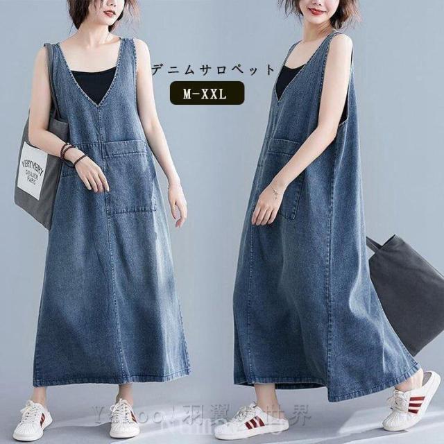 デニムサロペットスカートレディース体型カバージャンパースカートデニムワンピースロングワンピースマキシ丈ロング丈オールインワン40代50代60代