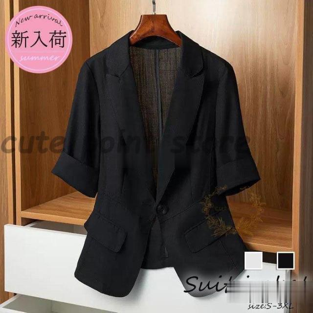 テーラードジャケットレディース 40代 半袖スーツジャケット 黒 ブレザーコート オシャレスーツ 薄手ブレザー オフィスアウター 春夏 カジュアル韓国風 通勤