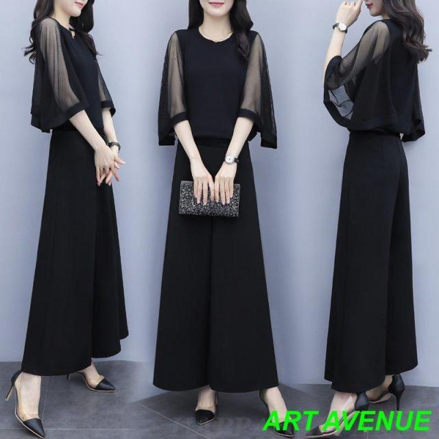 かっこいいパンツドレス 袖あり セパレート パーティードレス 結婚式 お呼ばれ ドレス 服装 セットアップ レディース パンツスーツ ワイドパンツ ドレス 大きいサイズ 五分袖 半袖 黒 ゆったり 体型カバー エレガント きれいめ 上品 シースルー フォーマル 女性 20代 30代 40代 50代 3L 4L 入学式 卒業式 入園式 卒園式 謝恩会 懇親会 ブラック
