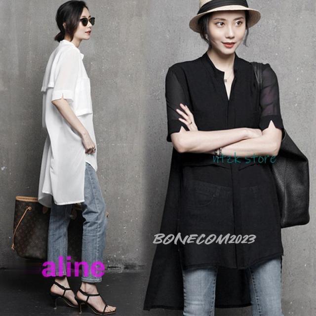 トップス ブラウス シフォンチュニック 黒 白 チュニック シンプル 無地 透かし シースルー 大人可愛い 体型カバー レディス レディース 夏 新作 ビッグシルエット後丈長チュニックブラウス