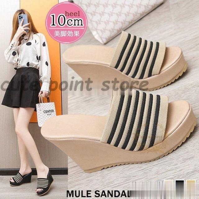 ミュールサンダル レディース 履きやすい 夏 サンダル ミュールサンダル 厚底靴 ウェッジソール ボーダーストライプミュールサンダル ビーチぺたんこ 歩きやすい