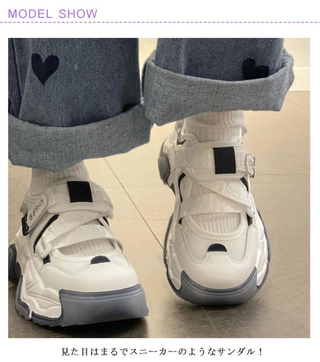 | ボリューム感ある厚底ソールが今な気分のスニーカーサンダル。 見た目はまるでスニーカーのようなサンダル! アッパー部分もメッシュ素材で通気性が良く、靴下合わせ、素足でも◎ 軽量なので歩きやすくデイリーに活躍間違いなし! | |