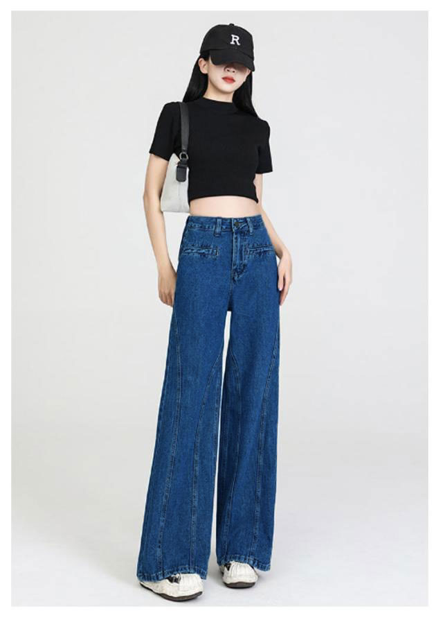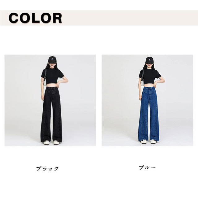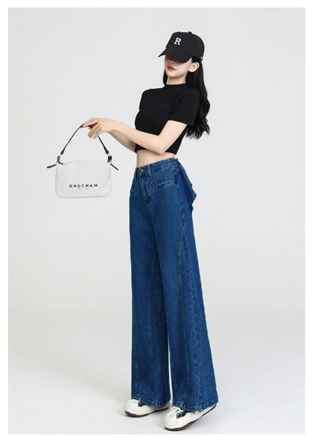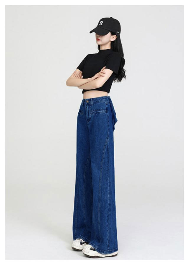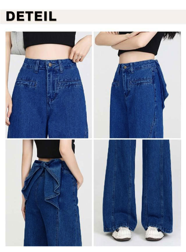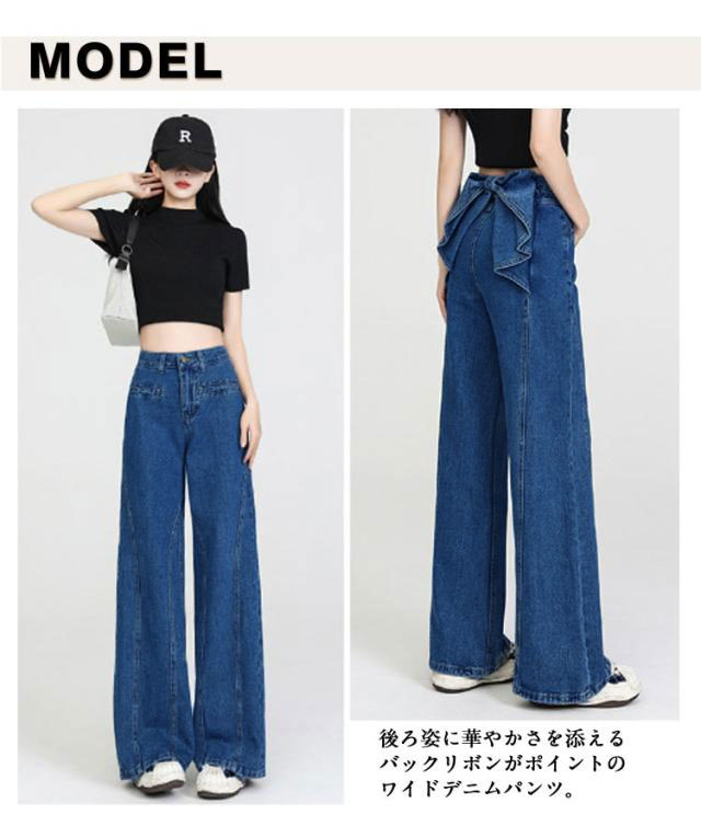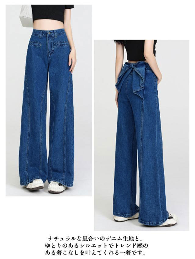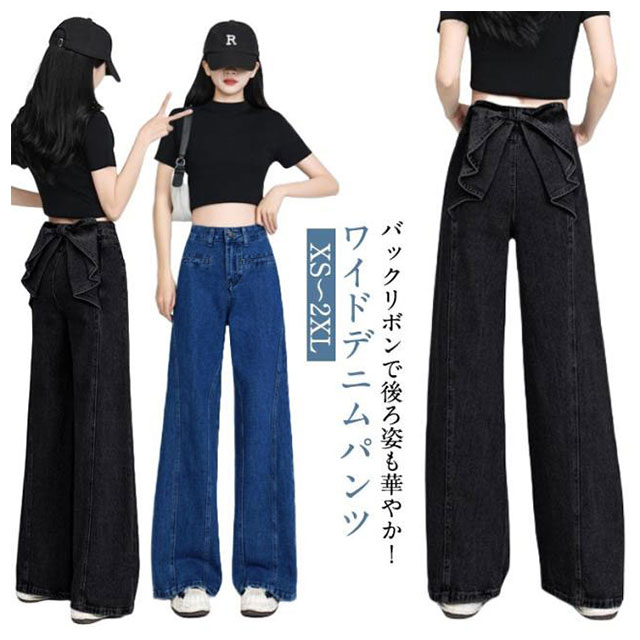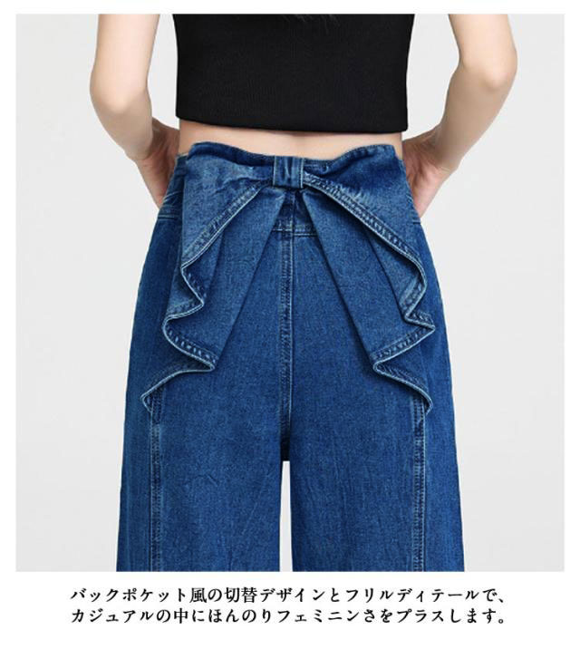 バックリボン デニムパンツ レディース デニムワイドパンツ ハイウエスト ステッチ フリル 後ろ姿映え ボトムス パンツ 美脚 デニム ジーパン ジーンズ ロング きれいめ ゆったり 大きいサイズ 小さいサイズ 体型カバー カジュアル かわいい 送料無料