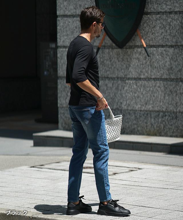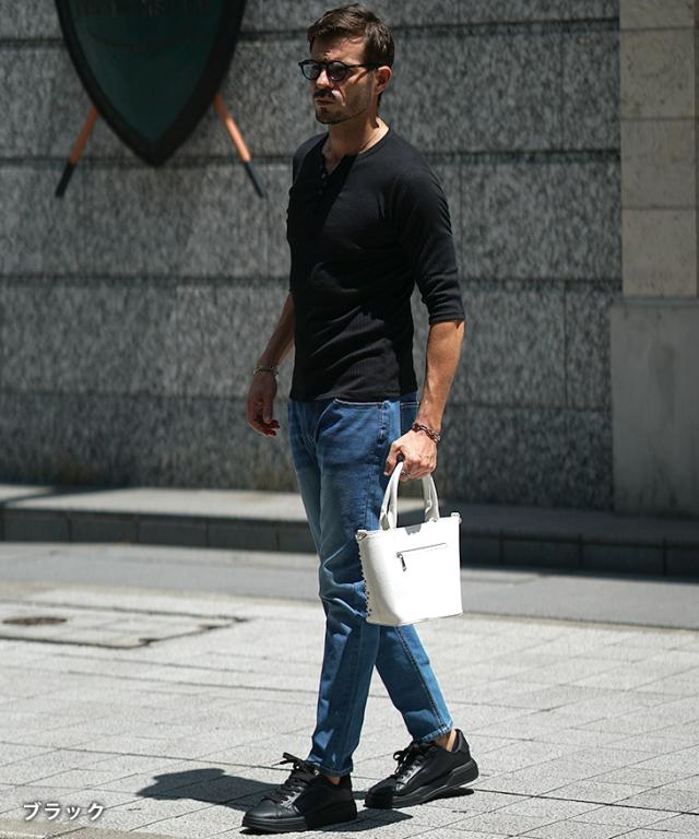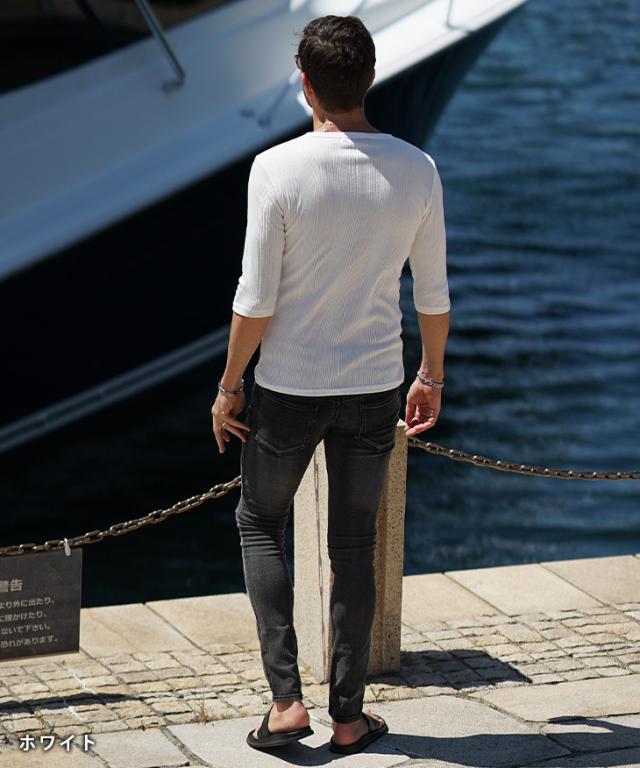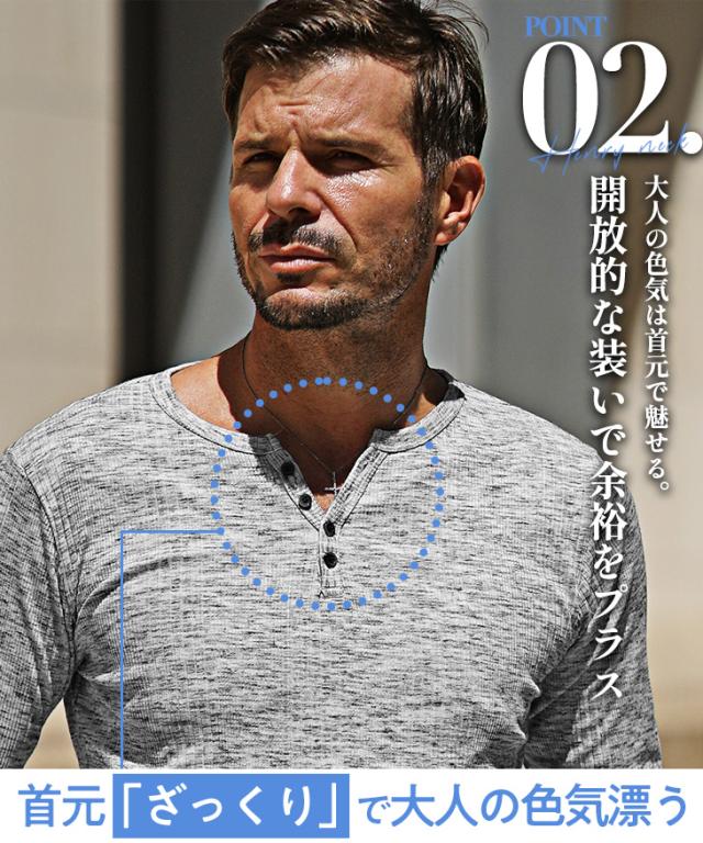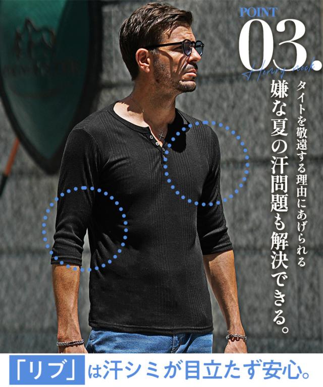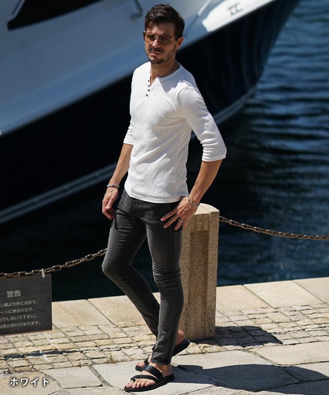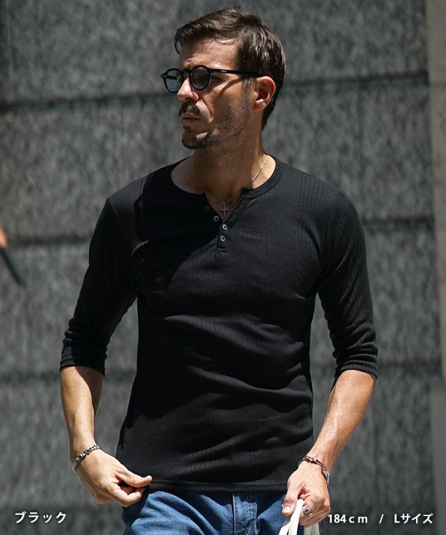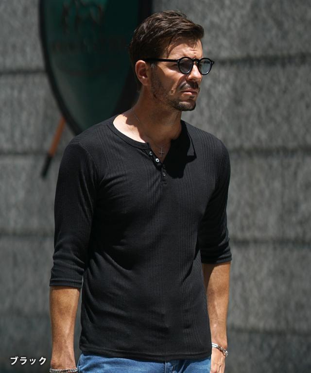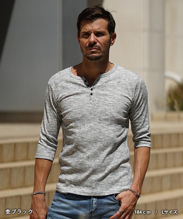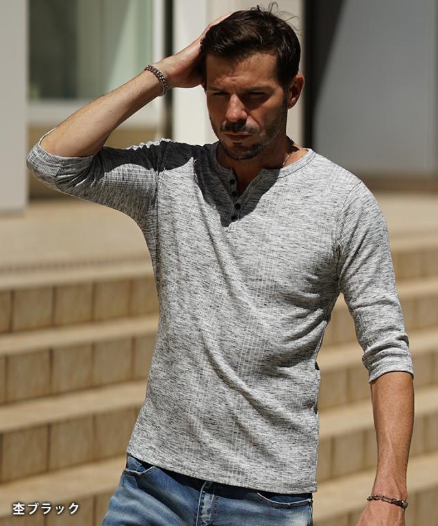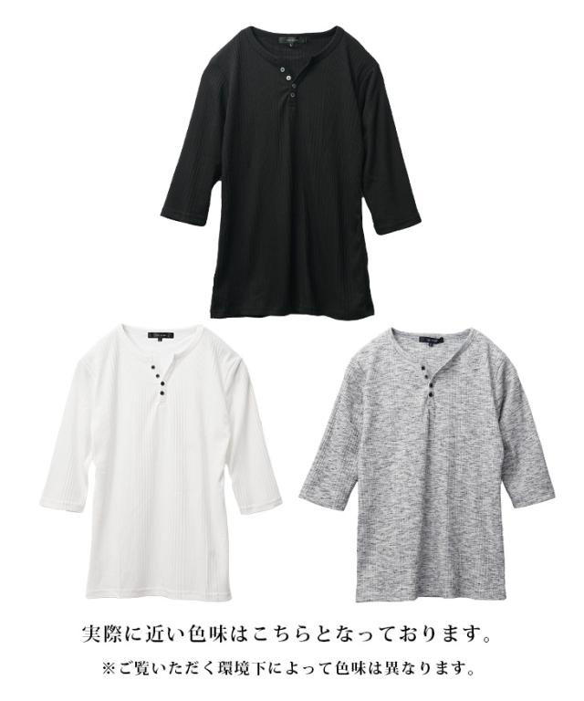スマートな品魅せTシャツ『テレコヘンリーネック7分袖Tシャツ』【テレコヘンリーネック7分袖Tシャツ】■Design / デザインブラック・ホワイト・杢ブラックの3色展開で、シンプルながら上品な印象を与える細身シルエットのヘンリーネックカットソー。襟元には4つボタンを配置し、上品さと程よいアクセントをプラス。一枚で着てもサマになり、ジャケットのインナーとしても映える、汎用性の高いデザインです。7分袖が腕まわりをすっきり見せ、清潔感のあるスタイリングを演出します。ボタンを開ければ抜け感のあるラフな着こなしに、閉めればきちんと感を演出でき、気分やシーンに合わせてアレンジ可能。