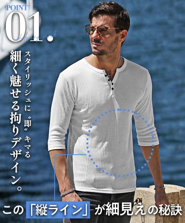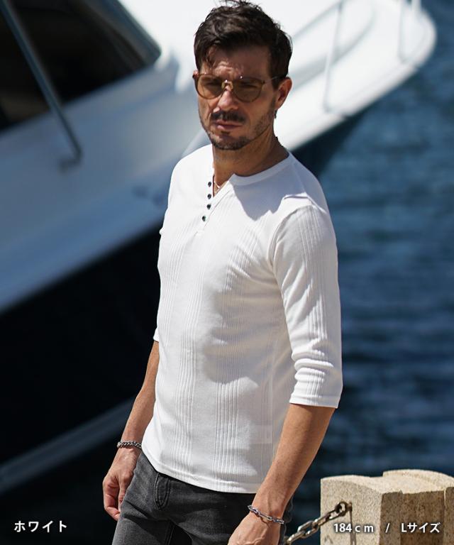 Tシャツ メンズ 七分袖 ヘンリーネック 細身 7分袖Tシャツ メンズ テレコ カットソー メンズ スリム ヘンリーネックTシャツ メンズ 7分袖 ストライプ