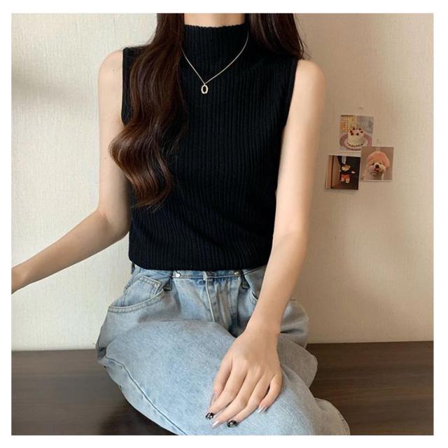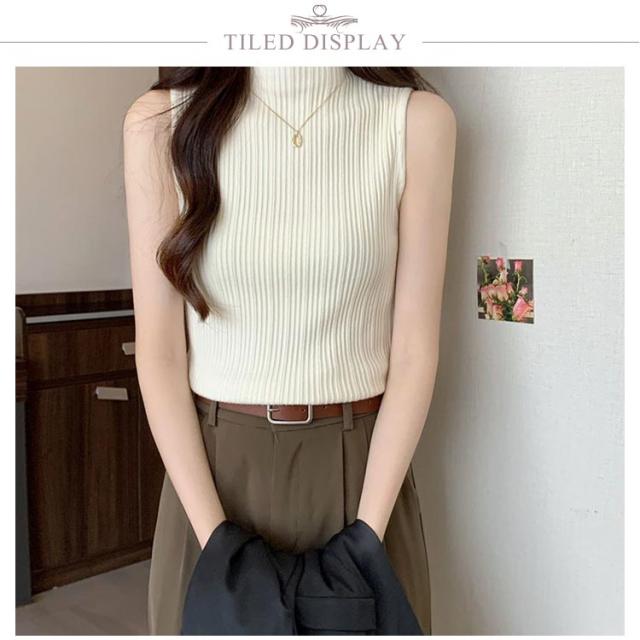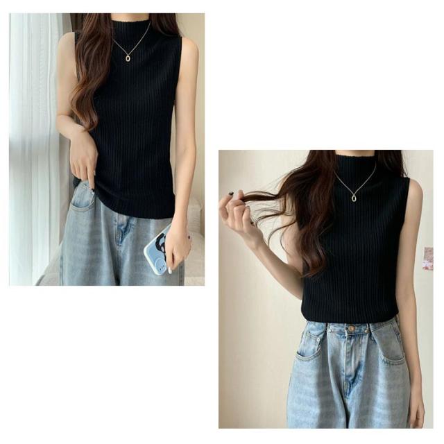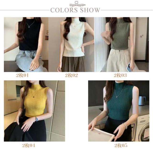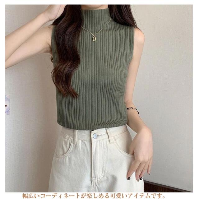 プリーツ 春 ハイネック タンクトップ ノースリーブ ニットトップス ハイネックニット ストレッチ トップス Tシャツ レイヤード シンプル 秋 夏 プリーツ 全10色