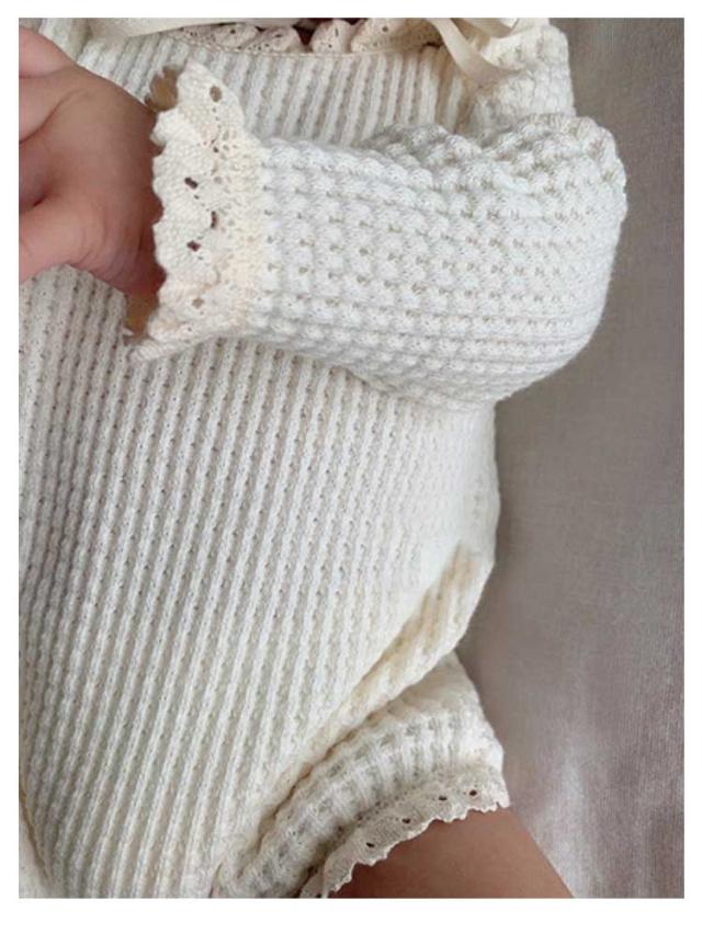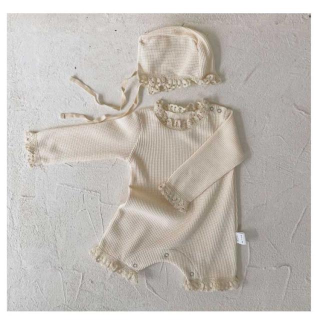 | 【帽子付き 2点セット】【セレモニードレス】【男女兼用 66—90cm】 肌触りの良いワッフル生地のボンネット付きベビーロンパース。 ボンネットや首元にあしらわれたコットンレースが可愛いポイント。 ボンネットはクラシカルヨーロッパ調。首の下でひもを結ぶタイプです。 新生児の退院着やお宮参りなどの写真撮影に大活躍です◎ | |
