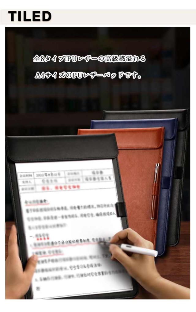 | 全8タイプ!PUレザーの高級感溢れるA4サイズのPUレザーパッドです。 オフィス、レストラン、ホテル、工事現場、商談、提案、会議、講座、訪問など様々なシーンで利用でき、机がないシーンで、下敷きとしても十分で、安定して書くことができます。 一般的な資料に一番多いとされるA4用紙が挟めるサイズで、使いやすいです。 書類をしっかりと固定できるマグネットを採用したPUレザーパッド。 | |