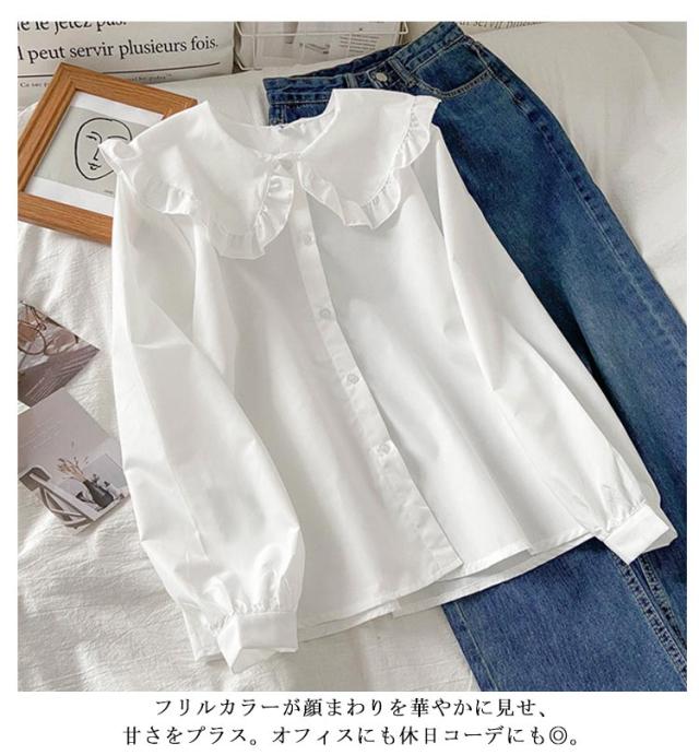 秋服 ルーズフィット レディース かわいい 長袖 ゆったり フリル襟シャツ 白 春服 シャツ 重ね着 S-2XLサイズ シャツブラウス 春秋 シンプル 体型カバー 白 無地 ナチュラル トップス カジュアルシャツ