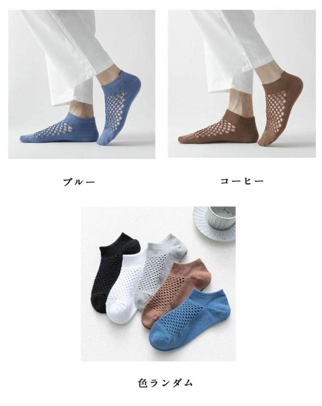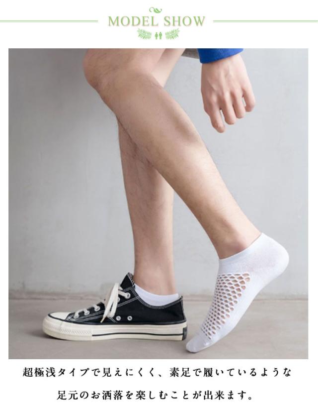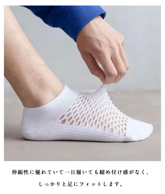 | 【10足セット】 通気性のよいメッシュ編みのスニーカーソックス。 超極浅タイプで見えにくく、素足で履いているような足元のお洒落を楽しむことが出来ます。 伸縮性に優れていて一日履いても締め付け感がなく、しっかりと足にフィットします。 薄手で通気性抜群なので、暑い季節におすすめ♪ メンズ用くるぶしソックスです。 | |