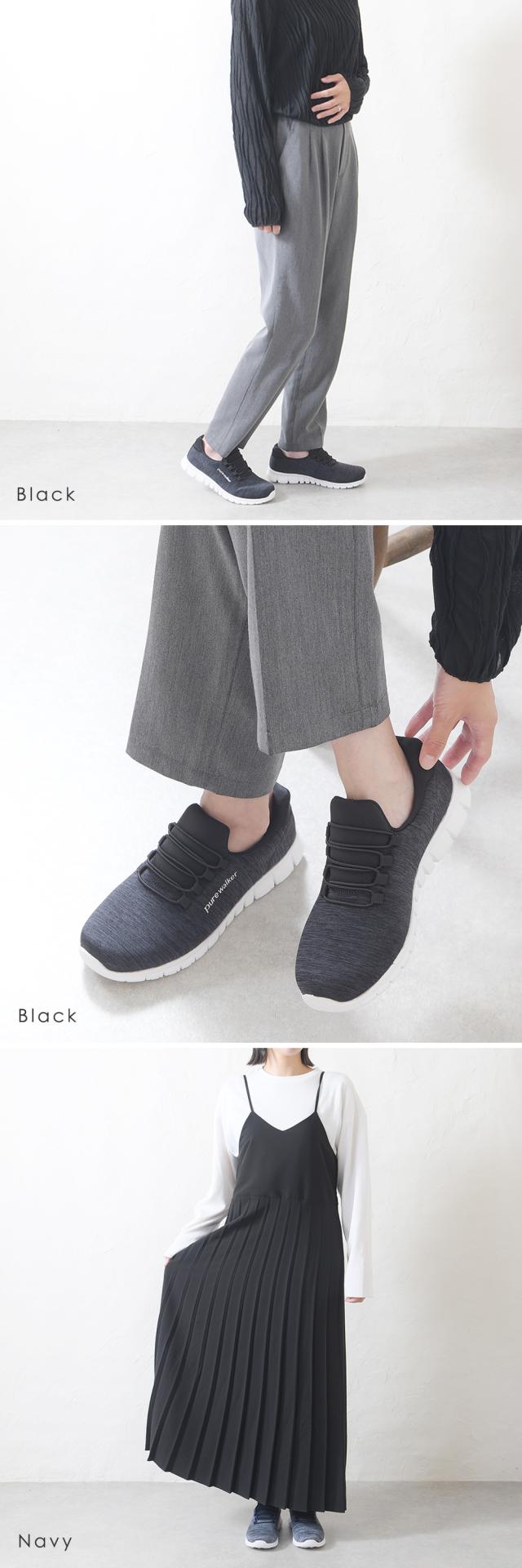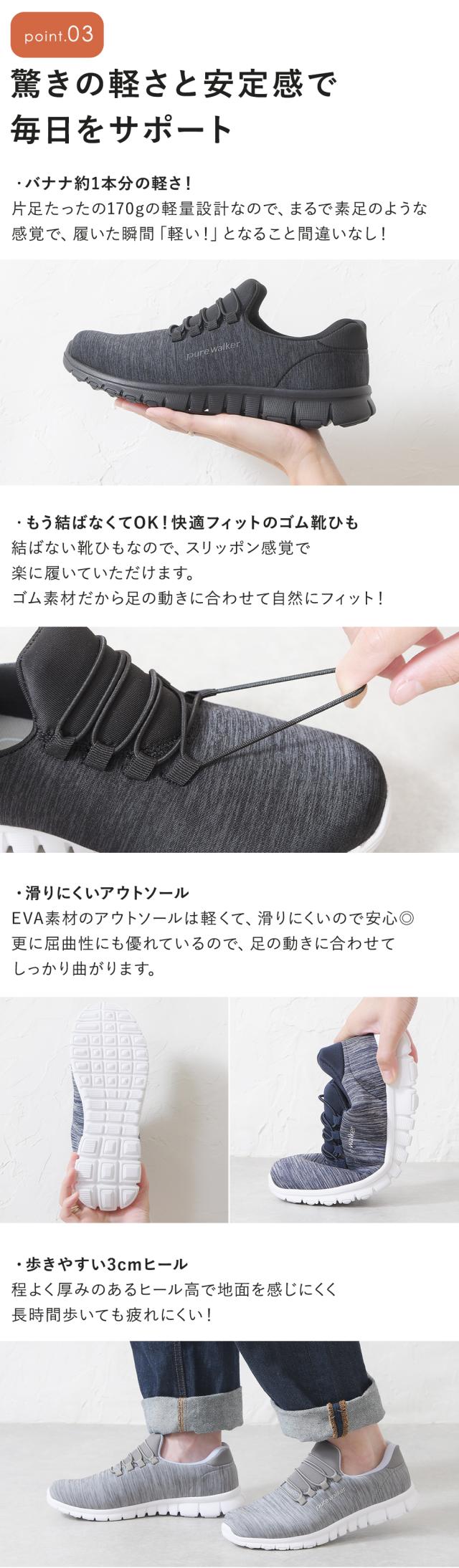 結ばないゴム紐で楽ちん! 歩きながら、姿勢のサポート、肩・腰のコリの軽減もできるBMZインソールを使用。 |