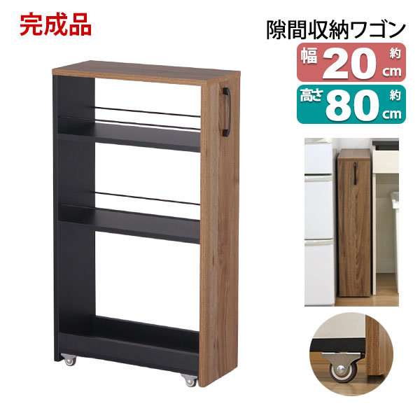 隙間 ラック すき間 ワゴン 完成品(取っ手のみ取付) 幅20cm 奥行45cm 高さ80cm キャスター付き キッチン 隙間収納 洗面所 すきま収納 脱衣所 すき間収納 冷蔵庫横 洗濯機横 おしゃれ キッチンラック 木製 調味料ラック 細い スリムラック ブラック×ブラウン AHSW-200B