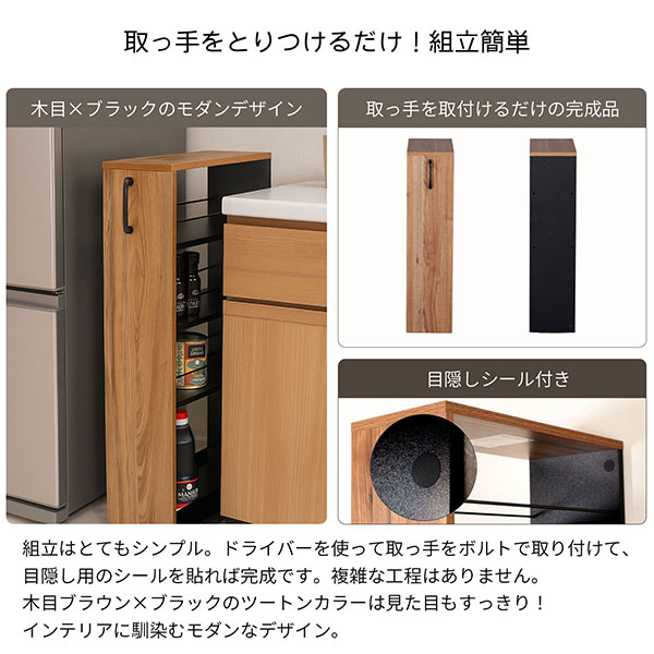 「使いにくい“すき間”が、活きた収納に変わる」 狭い場所にこそ収納が欲しい——そんなニーズに応えた、自由に高さを選べるスリム収納ワゴン。1人暮らしからファミリー層まで、住まいの形にフィットする機能美を追求しました。日々の暮らしに寄り添う“ちょっと便利”を形にした、新しい省スペース家具の提案です。 ◆「隙間収納ワゴン」シリーズ【ベース200】の特徴 ※こちらは【ベース200】販売のページでございます。ご購入の前にご確認ください。 ・【ベース】+【上棚】で高さ2WAY(約80cm / 約160cm)・ちょっとしたすき間を無駄にしない!「隙間ワゴンシリーズ」は、幅15/20/25/30cmの狭小空間にもぴったり収まるスリム設計。 ・【ベース】単体でロータイプの収納ワゴンとして使っても、【上棚】を重ねてハイタイプとしても使用して頂けます。 ・引出ししやすい取っ手付き。 ・キャスター付きで出し入れスムーズ、どこでも使える万能ワゴンです。 ※幅30cmの商品のみ、ワゴンを動かす向きを変えるために、キャスターの方向を変えることができます。 あらかじめ底板に取り付けられているキャスターのネジを外し、誘導穴が1個追加でありますので方向を変えた後にネジをドライバーで締めてください。 ・正面からキャスターが見えにくい、シンプルで洗練された外観。 ・固定棚なので高さ調整不要!そのまま使える手軽さが◎。 ・背面落下防止バー付きでボトル類の収納も安心。 ・下部には揺れ防止の桟がワゴンをしっかりと安定させてくれます。 ・水や汚れに強いメラミン樹脂化粧繊維板を採用。 ・組立はとてもシンプル。ドライバーをご用意いただいて、ボルトで取っ手を取り付けるだけの完成品です。 ・木目ブラウン×ブラックのスタイリッシュなツートンカラーは、見た目もすっきり、インテリアに馴染むモダンデザイン。 ■こんな場所で使えます!■ ・キッチンボードや冷蔵庫脇の隙間収納に ・キッチンカウンターやランドリー用の収納に ・デスク脇にサイドワゴンとして ※必ず物と物のすきまでご使用ください。すきま以外のご使用は転倒の危険性があります。 また、動かすときは隙間からすべて出さない等、転倒に十分ご注意ください。 |