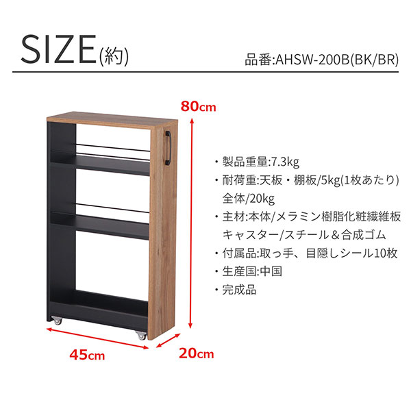 隙間 ラック すき間 ワゴン 完成品(取っ手のみ取付) 幅20cm 奥行45cm 高さ80cm キャスター付き キッチン 隙間収納 洗面所 すきま収納 脱衣所 すき間収納 冷蔵庫横 洗濯機横 おしゃれ キッチンラック 木製 調味料ラック 細い スリムラック ブラック×ブラウン AHSW-200B スリム 3段 木目調 家具 インテリア 収納家具 収納 棚 3段ラック 収納ラック キャスター付き ストッカー すき間ラック すきま収納 すき間収納 スチールラック キャスターラック 整理棚 サイドラック スリムラック キッチン収納棚 キッチンストッカー スパイスラック ボトルラック キッチンワゴン ペットボトル 食料品 ストック 収納 ランドリーラック 洗剤 ストック タオル収納 コンパクト 省スペース 新生活 一人暮らし ワンルーム キッチン 台所 リビング ダイニング 玄関 洗面台横 トイレ オフィス 店舗 サロン 仕事場 デスクサイド デスク横 ベッドサイド ベッド横 シンプル モダン ナチュラル スタイリッシュ かっこいい シック すっきり 片付け 整理整頓 お手入れ簡単 水に強い 汚れに強い 傷がつきにくい 移動しやすい デッドスペースを有効活用 |