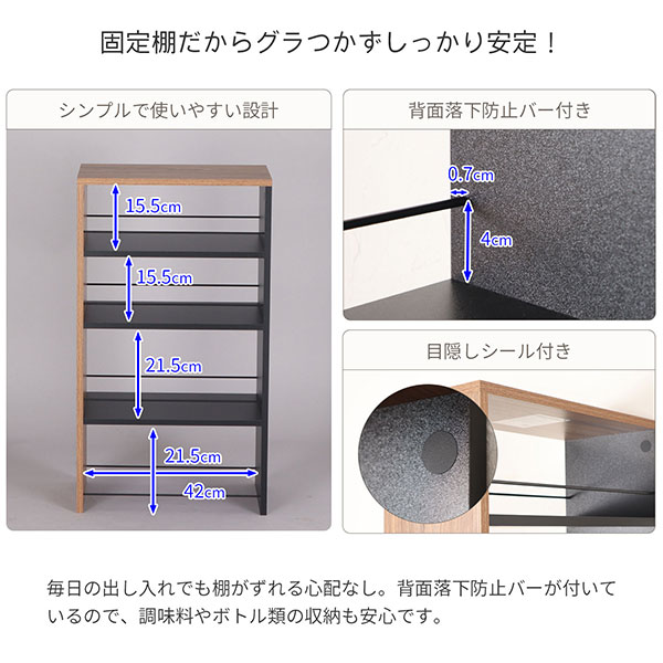 ・製品サイズ(約):幅25×奥行45×高さ80cm ・製品重量(約):8.7kg ・耐荷重(約):1枚あたり5kg、全体耐荷重15kg ※【上棚】+【ベース】セットで静止時35kg ・主材:本体/メラミン樹脂化粧繊維版 ・付属品:連結ボルト4本、カムロック4個、目隠しシール8枚 ・生産国:中国 ・お客様組立品 ※モニターの発色具合により、実際の色と異なる場合がございます。 |