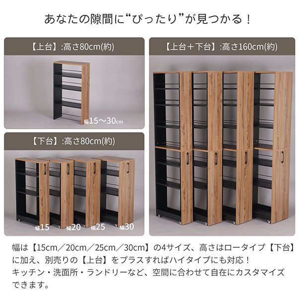 「使いにくい“すき間”が、活きた収納に変わる」 狭い場所にこそ収納が欲しい——そんなニーズに応えた、自由に高さを選べるスリム収納ワゴン。1人暮らしからファミリー層まで、住まいの形にフィットする機能美を追求しました。日々の暮らしに寄り添う“ちょっと便利”を形にした、新しい省スペース家具の提案です。 ◆「隙間収納ワゴン」シリーズ【ベース300】の特徴 ※こちらは【ベース300】販売のページでございます。ご購入の前にご確認ください。 ・【ベース】+【上棚】で高さ2WAY(約80cm / 約160cm)・ちょっとしたすき間を無駄にしない!「隙間ワゴンシリーズ」は、幅15/20/25/30cmの狭小空間にもぴったり収まるスリム設計。 ・【ベース】単体でロータイプの収納ワゴンとして使っても、【上棚】を重ねてハイタイプとしても使用して頂けます。 ・引出ししやすい取っ手付き。 ・キャスター付きで出し入れスムーズ、どこでも使える万能ワゴンです。 ※幅30cmの商品のみ、ワゴンを動かす向きを変えるために、キャスターの方向を変えることができます。 あらかじめ底板に取り付けられているキャスターのネジを外し、誘導穴が1個追加でありますので方向を変えた後にネジをドライバーで締めてください。 ・正面からキャスターが見えにくい、シンプルで洗練された外観。 ・固定棚なので高さ調整不要!そのまま使える手軽さが◎。 ・背面落下防止バー付きでボトル類の収納も安心。 ・下部には揺れ防止の桟がワゴンをしっかりと安定させてくれます。 ・水や汚れに強いメラミン樹脂化粧繊維板を採用。 ・組立はとてもシンプル。ドライバーをご用意いただいて、ボルトで取っ手を取り付けるだけの完成品です。 ・木目ブラウン×ブラックのスタイリッシュなツートンカラーは、見た目もすっきり、インテリアに馴染むモダンデザイン。 ■こんな場所で使えます!■ ・キッチンボードや冷蔵庫脇の隙間収納に ・キッチンカウンターやランドリー用の収納に ・デスク脇にサイドワゴンとして ※必ず物と物のすきまでご使用ください。すきま以外のご使用は転倒の危険性があります。 また、動かすときは隙間からすべて出さない等、転倒に十分ご注意ください。 |