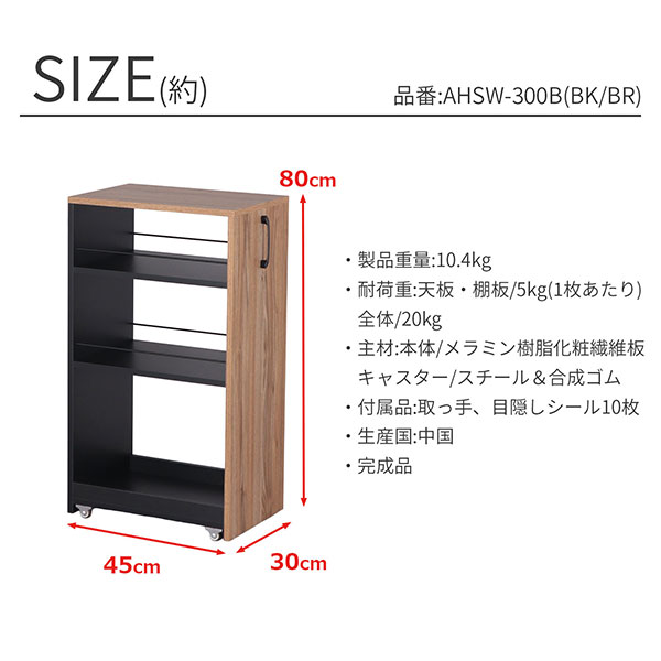 隙間 ラック すき間 ワゴン 完成品(取っ手のみ取付) 幅30cm 奥行45cm 高さ80cm キャスター付き キッチン 隙間収納 洗面所 すきま収納 脱衣所 すき間収納 冷蔵庫横 洗濯機横 おしゃれ キッチンラック 木製 調味料ラック 細い スリムラック ブラック×ブラウン AHSW-300B スリム 3段 木目調 家具 インテリア 収納家具 収納 棚 3段ラック 収納ラック キャスター付き ストッカー すき間ラック すきま収納 すき間収納 スチールラック キャスターラック 整理棚 サイドラック スリムラック キッチン収納棚 キッチンストッカー スパイスラック ボトルラック キッチンワゴン ペットボトル 食料品 ストック 収納 ランドリーラック 洗剤 ストック タオル収納 コンパクト 省スペース 新生活 一人暮らし ワンルーム キッチン 台所 リビング ダイニング 玄関 洗面台横 トイレ オフィス 店舗 サロン 仕事場 デスクサイド デスク横 ベッドサイド ベッド横 シンプル モダン ナチュラル スタイリッシュ かっこいい シック すっきり 片付け 整理整頓 お手入れ簡単 水に強い 汚れに強い 傷がつきにくい 移動しやすい デッドスペースを有効活用 |