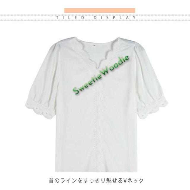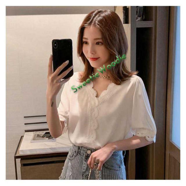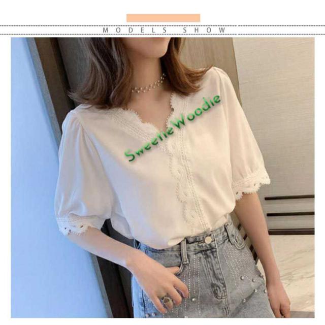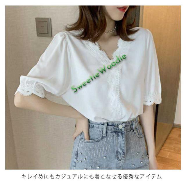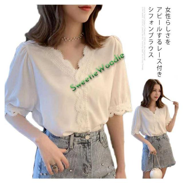 シフォンブラウス レディース 五分袖 Vネックブラウス プルーオーバー トップス 七分袖 レース付き 半袖 無地 薄手 お洒落 キレイめ フェミニン