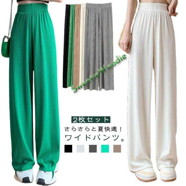 パンツ 春夏 ボトムス さらてろ 夏 冷感 リブ 接触冷感 レディース 夏服 きれいめ プリーツ 【2枚セット】ワイドパンツ ひんやり UVカット カ