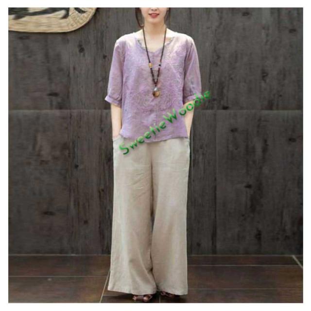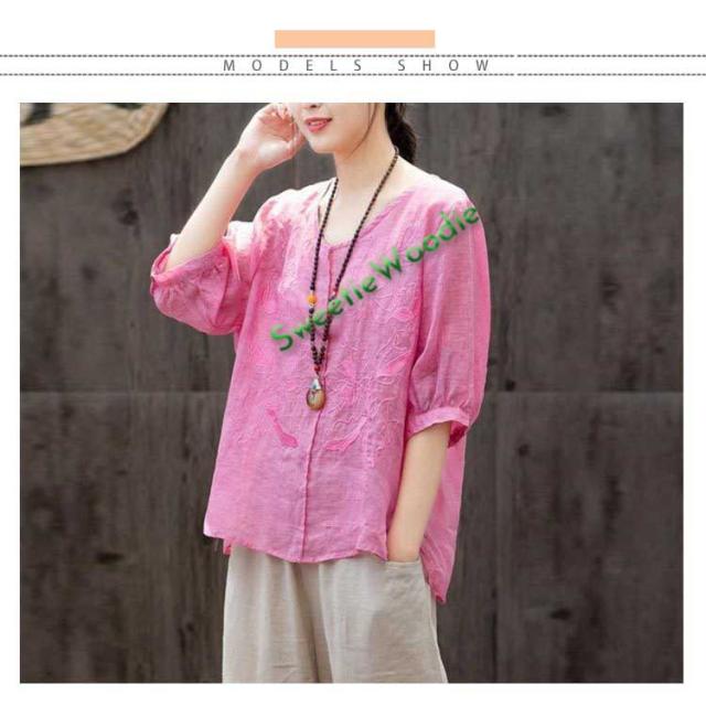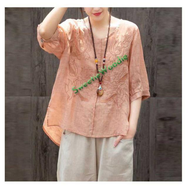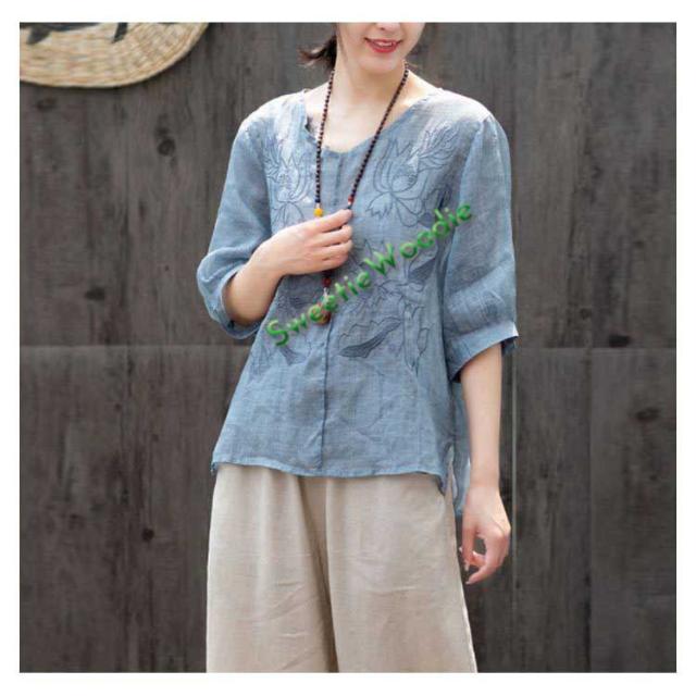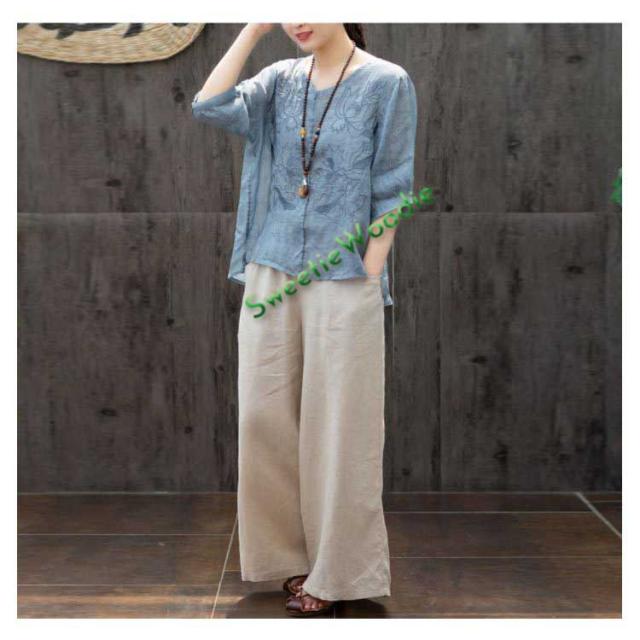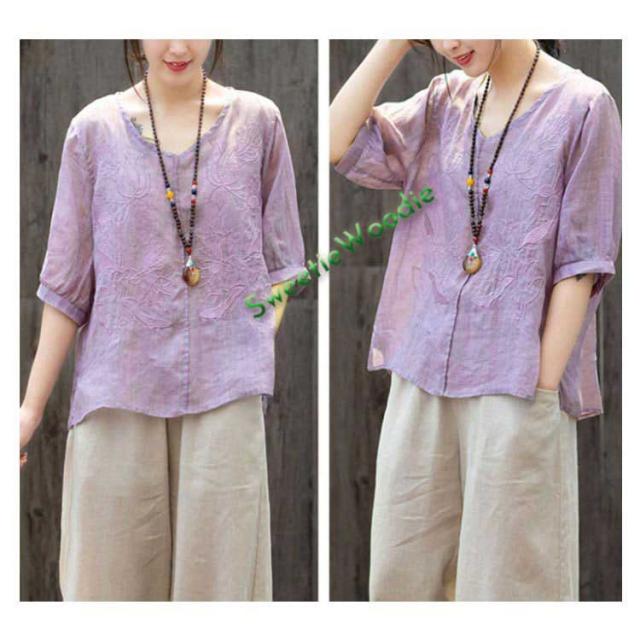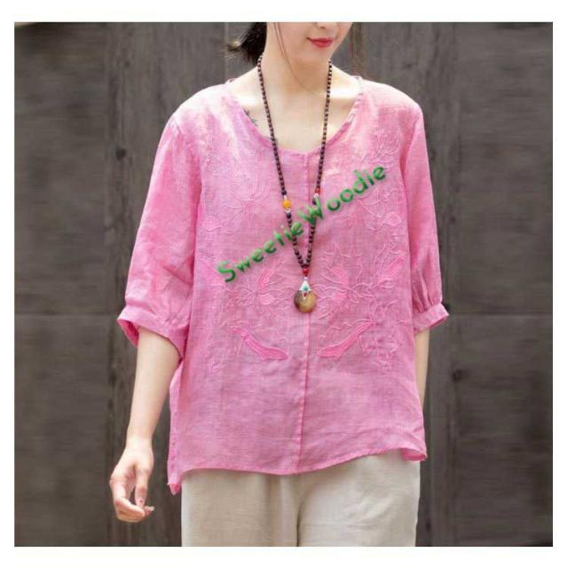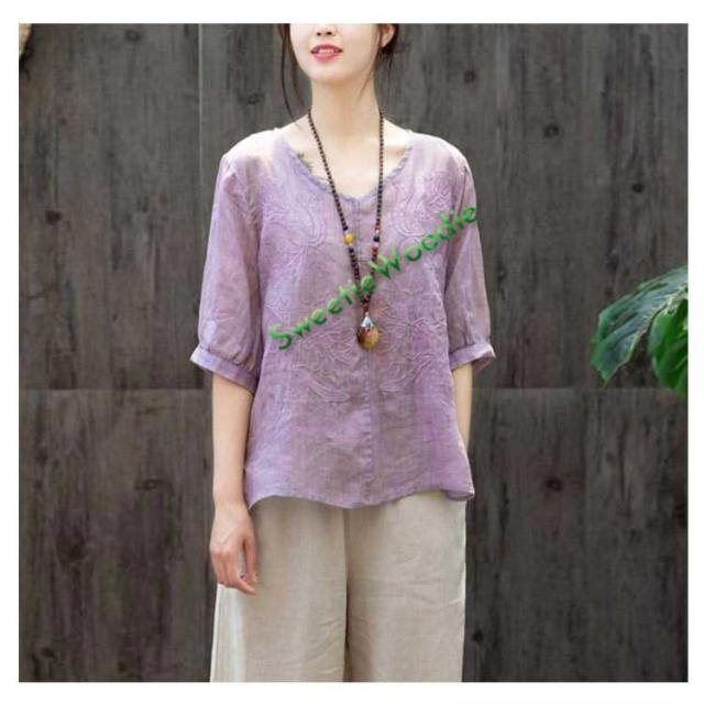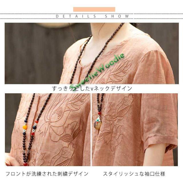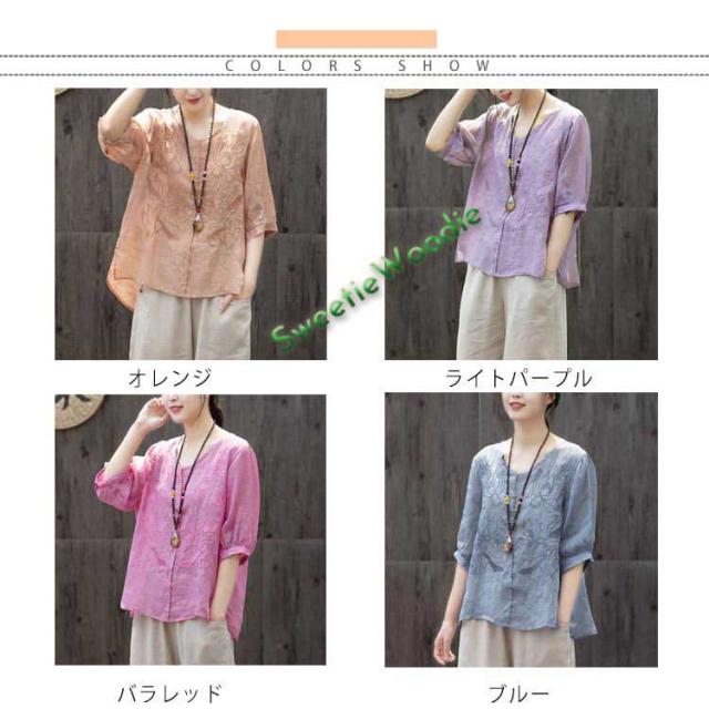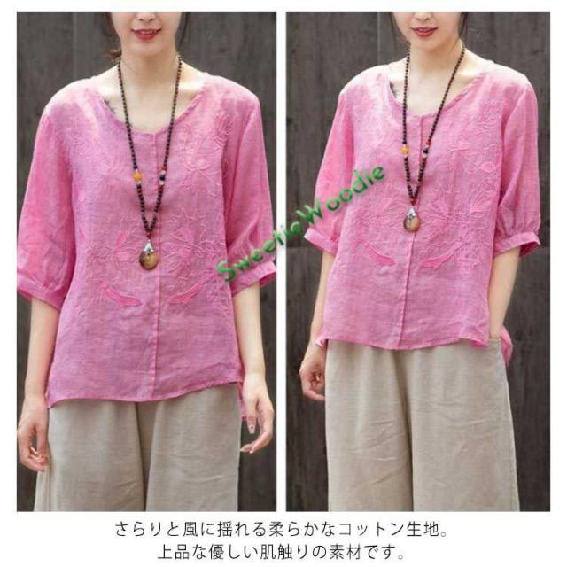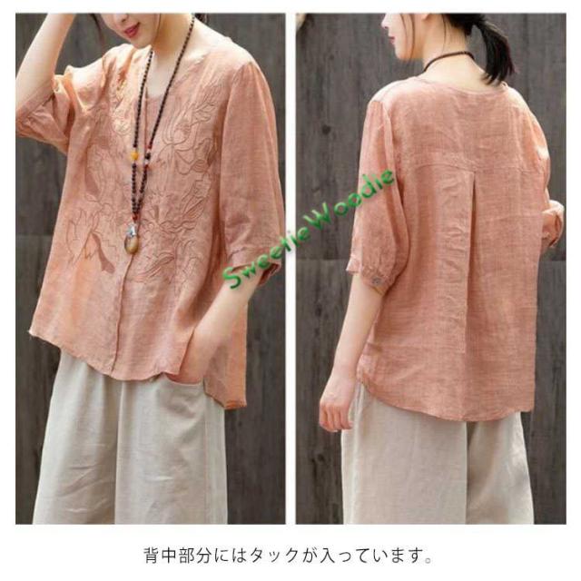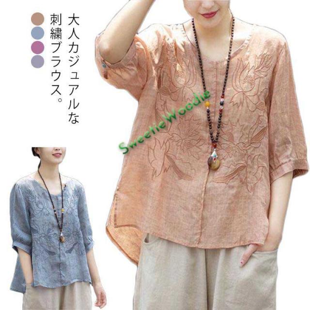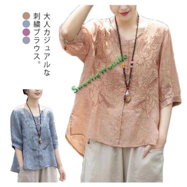 ブラウス レディース シャツ 刺繍 トップス 七分袖 Tシャツ プルーオーバー 綿麻 Vネック ゆったり 五分袖 体型カバー コットン リネン スリッ
