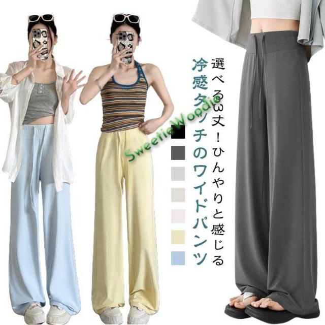 涼しい 高身長 ひんやり ロングパンツ イージーパンツ 春夏 レディース ワイドパンツ 薄手 夏用 滑らか 選べる3丈 ポケット付き 低身長 ワイドパ