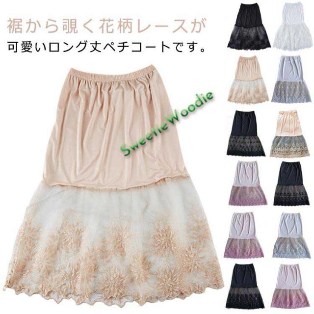 レースペチコート 裾ふんわり ミモレ丈 ペチコート 刺繍 膝下丈 チュール スカート ペチコート スカート ロングスカート ウエストゴム レディース
