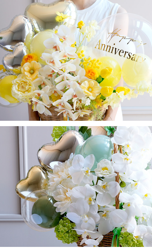 使用しているお花はすべて高品質な造花。「いつも満開」「花粉や匂いの心配なし」「水やり不要で衛生的」と、長く美しさを保てるので贈り物にも最適です。