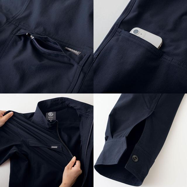 縦横どちらにもストレッチする軽量生地に加え、ツナギで一番のストレスであるトイレ問題も“特許取得のヒップオープン機能”でクリア。ファスナー付きポケットにスマホ用ポケット、そして表面にボタンやファスナーが出ていないプロスペック。まさにストレスフリーなツナギです。