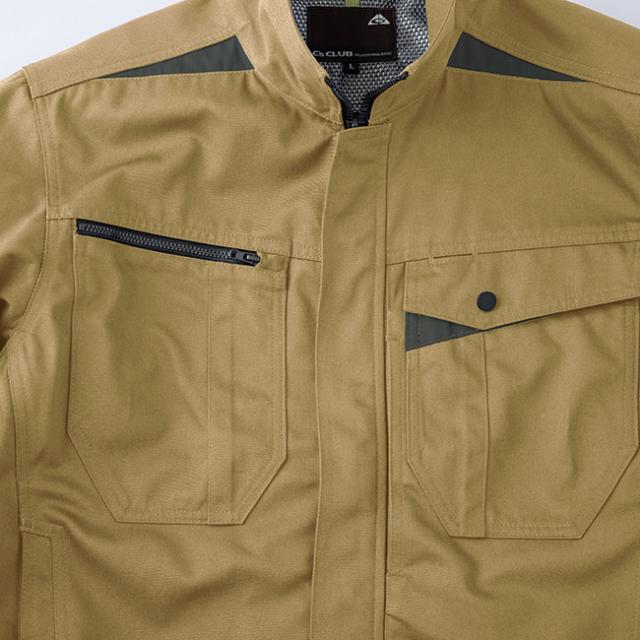 収納力についても定番のポケットの他に、ジャケットでは左胸スラッシュポケット、パンツでは右脇にファスナーポケットを備えています。