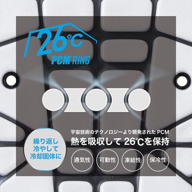 PCM(相交換物質)とは宇宙服の技術を応用して、外気温の急激な変化から宇宙飛行士の体を守るために開発された素材で、温度調節機能に特化した新素材です。通常、水は0℃で凍結しますが、このPCM素材は凍結温度を調節できるのが特徴です。