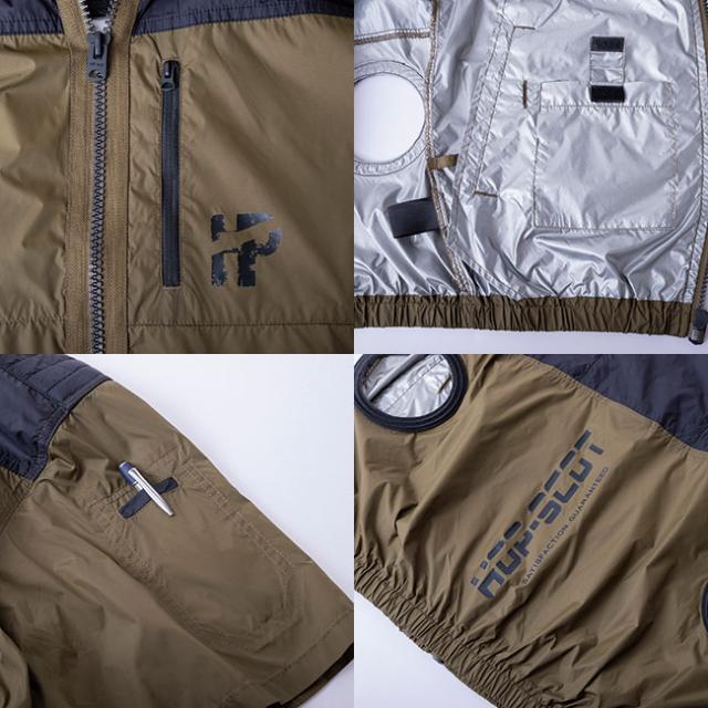 背面にはフルハーネス対応用にランヤード通し口があり、前面にハーネス着用時にも使用しやすい縦型ポケットをデザインしました。裏チタンコーティングにより紫外線遮蔽率97.7%(UPF50%)のUVカット性能があり猛暑時には暑さも和らげます。