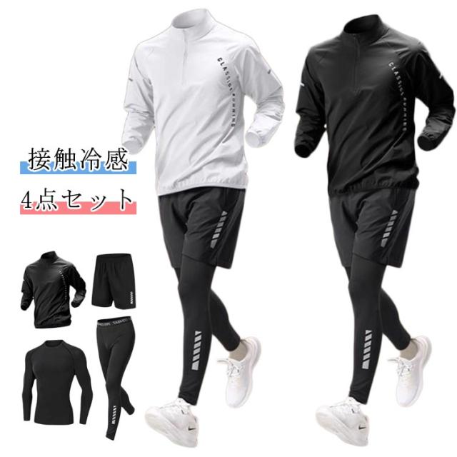 コンプレッションウェア 接触冷感 ジムウェア 長袖 スポーツウェア 4点セット トレーニングウェア おしゃれ メンズ セットアップ 吸水速乾 上下セット 4点セット ジャージ ランニングウェア ウォーキング 半袖 運動着 ゴルフウェア オールシーズン 春 夏 秋 冬